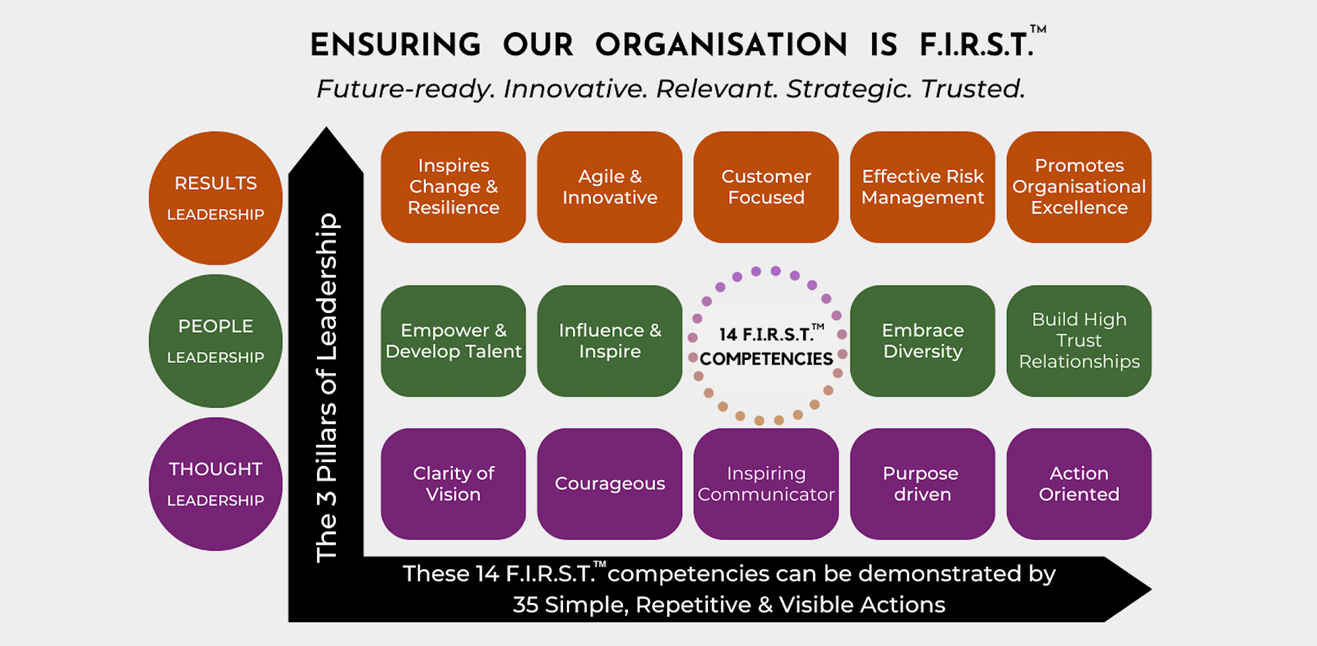 The framework helps you view these three leadership competencies through the lens of five outcomes that are the hallmark of any inspiring leader and effective manner; the need to be F.I.R.S.T. - which is, Future-ready, Innovative, Relevant, Strategic and Trusted.